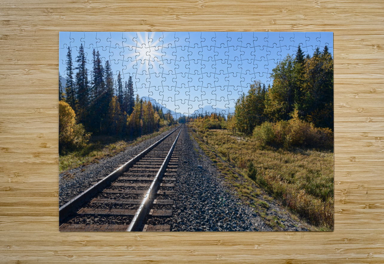 Banff train tracks with sun mountains 3 Justin Richard Batten Puzzle printing