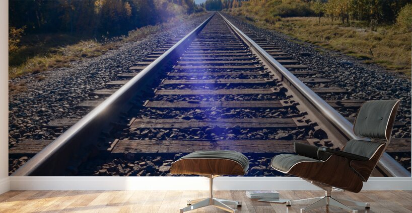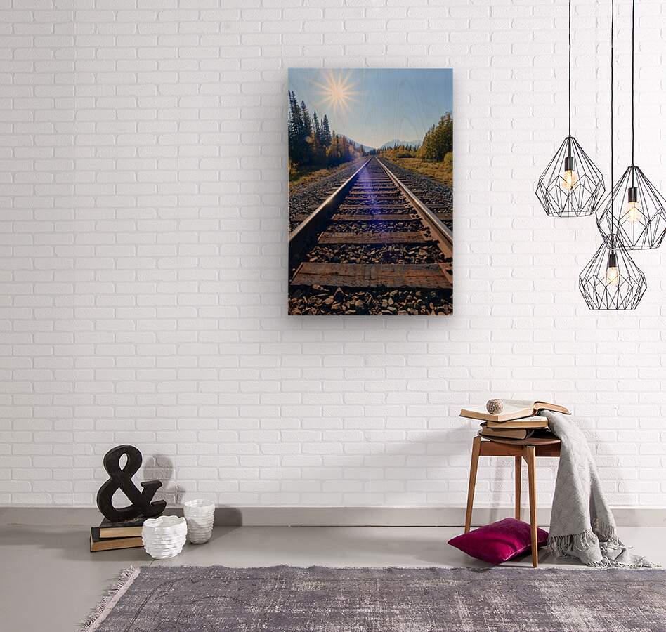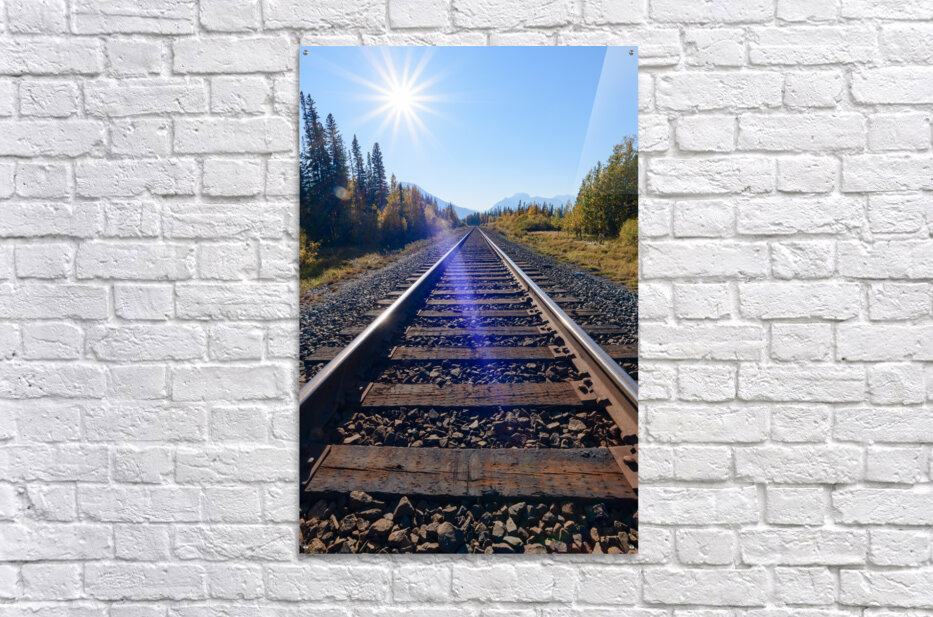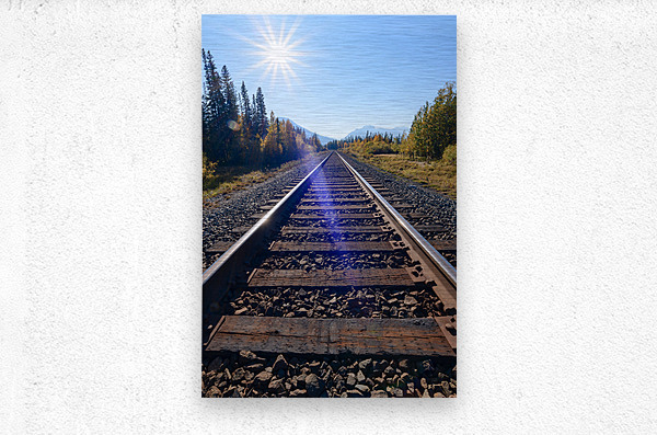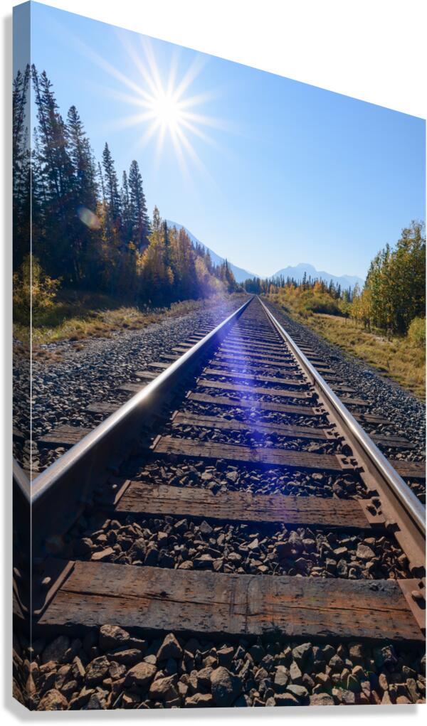 Get this artwork "Banff Train Tracks with sun" in a framed print.