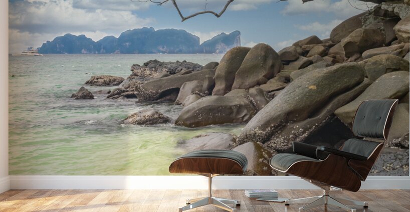 Seascape shoreline beach with rocks and tree with Ko Phi Phi island in the background.