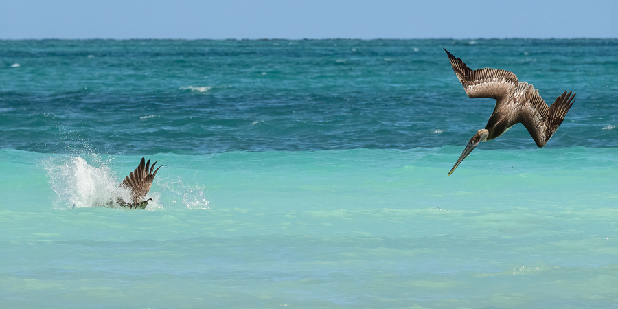 Two cuban pelicans dive fishing in the ocean