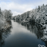 Montague river snow covered trees winter landscape with reflection