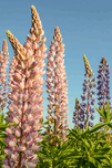 Colourful Lupins in bloom on a blue sky background
