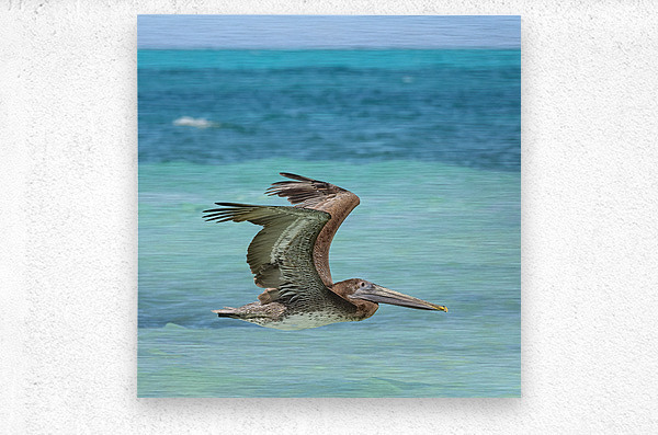 A Cuban Pelican in flight over caribbean ocean aqua waters