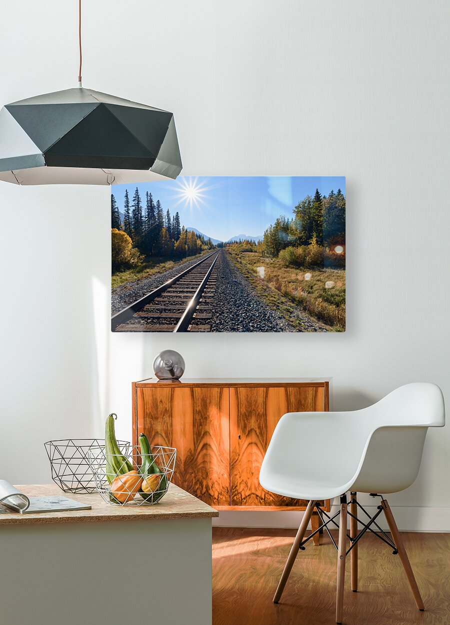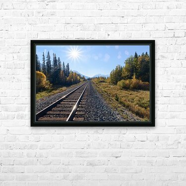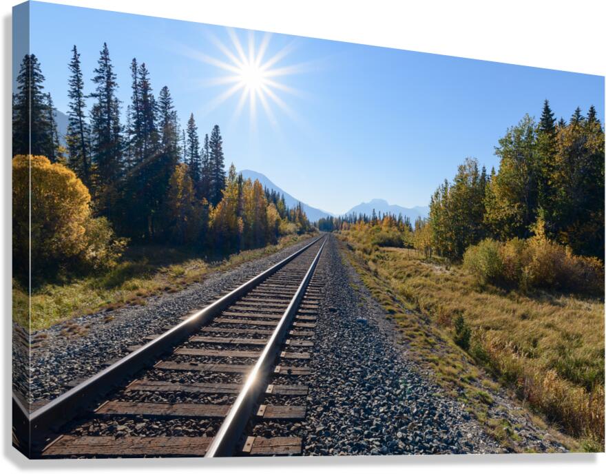 Pour obtenir "Banff train tracks with sun mountains 3" dans une impression encadrée.