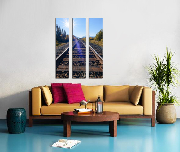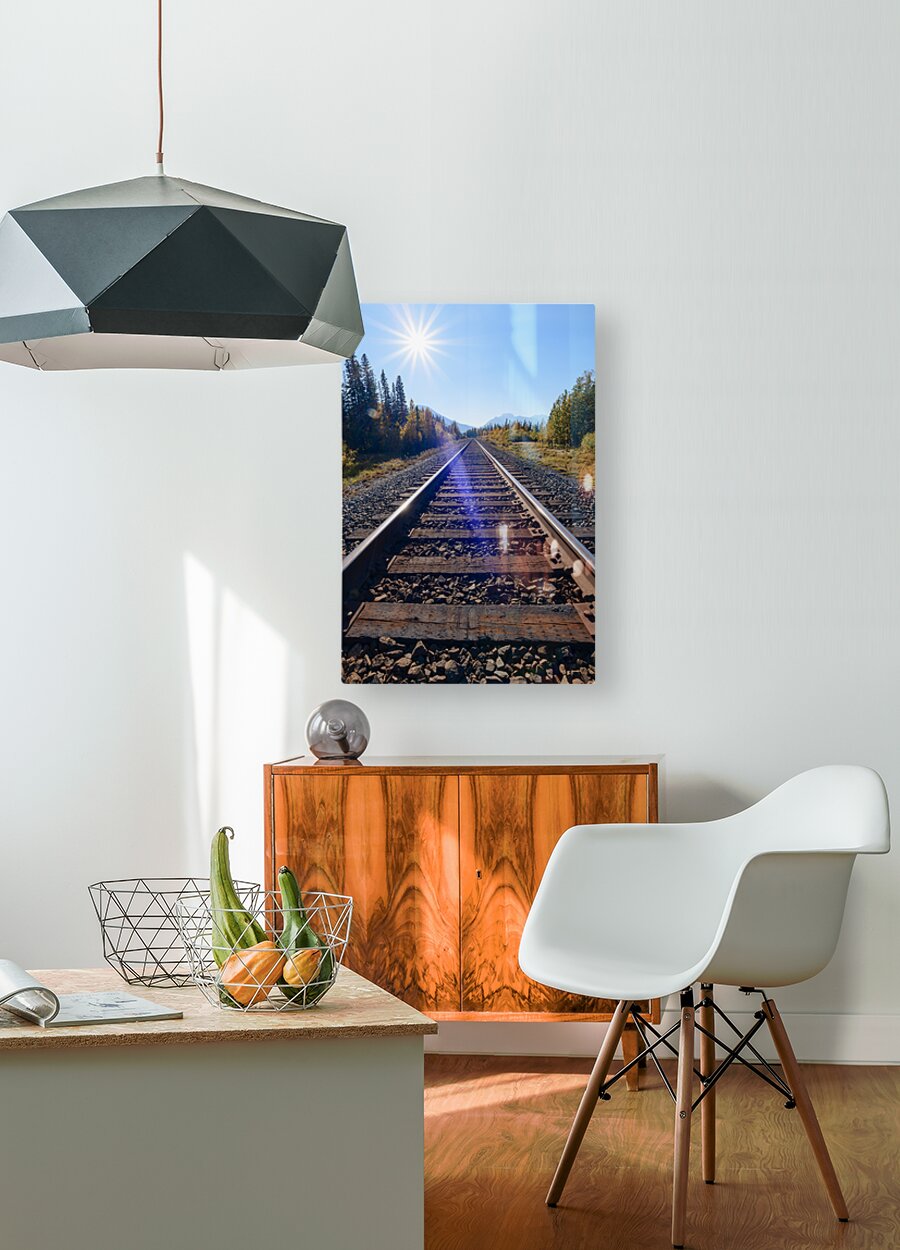 SUR CETTE OEUVRE: BANFF TRAIN TRACKS WITH SUN